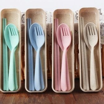 Kunststoff Verwenden Sie für solche Geräte speziellen Kunststoff in Lebensmittelqualität. Sie sind leicht und praktisch (wenn Sie nicht absichtlich versuchen, sie zu zerbrechen, halten sie lange). Oft werden diese Kits mit Schachteln oder Thermoskanne für Suppen geliefert.