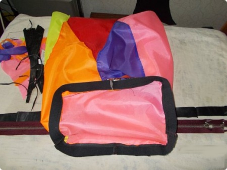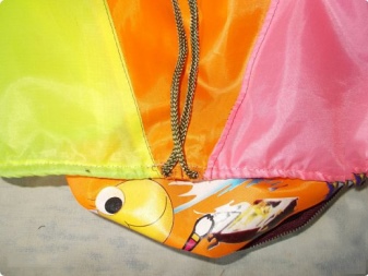 - Machen Sie aus den Resten des Grundgewebes (Regenschirm) zwei Schlaufen mit einer Breite von 0,7 cm, stecken Sie sie dann an die Unterseite der Haut und befestigen Sie den zweiten Riemen, der zu einem Ring zusammengesetzt ist.