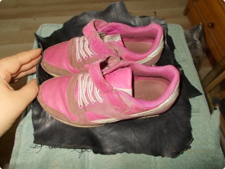 - auf die Leinwand aus Leder (Kunstleder) Schuhe der richtigen Größe legen, kreisen und um den gesamten Umfang 2-3 cm einplanen;