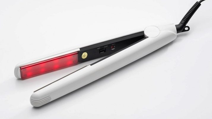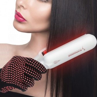 Ein Infrarot-Haarglätter ist ein einzigartiges Gerät, das aus zwei Platten besteht, die sich an einer Strähne schließen und diese durch sich selbst führen. Eine der Seiten des Geräts hat einen Infrarotstrahler, die zweite arbeitet im Ultraschallbereich. Zusammen bilden sie einen molekularen Verdampfer, der sie bei Kontakt mit Arzneimitteln in Dampf umwandelt und die notwendigen Inhaltsstoffe tief aufnimmt. Ein solches Gerät ist nicht für das Styling geeignet, wird jedoch in der Kosmetik im Rahmen einer umfassenden Haarpflege eingesetzt.