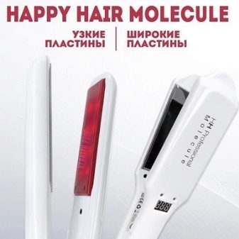- Happy Hair Molecule Professional. Ein professionelles Modell zur Verbesserung der Effektivität von Salonverfahren. Das Gerät in einem eleganten Gehäuse sieht ziemlich beeindruckend aus, es ist nicht mit einem Informationsdisplay ausgestattet, die Bedienelemente befinden sich auf der Seitenwand. Das Gerät unterstützt nicht den Betrieb jeder Platte einzeln, es gibt Versionen mit schmalen und breiten Arbeitsflächen. Dieses Eisen hat eine optimale Wellenfrequenz, wird erfolgreich zur Laminierung, Keratin Haarglättung in einem Friseur eingesetzt.