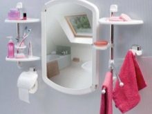 - Eckregale. Kompakter und praktischer Teil, der sich in der Ecke befindet, wo alle wichtigen Dinge passen: Duschgel, Shampoo, Schwämme und andere kleine Dinge.