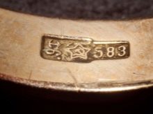 - 1958 begannen sie, auf sowjetisches Gold zu setzen Marke, die in der UdSSR als Qualitätszeichen bezeichnet wurde. Es sah aus wie ein fünfzackiger Stern mit einer Sichel und einem Hammer. Ein solches Zeichen wurde nur auf Schmuck angebracht.