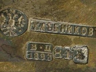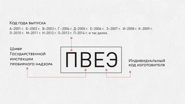 - "Tee." Eine solche Marke wurde vor 1896 angebracht und sah aus wie ein Abschlag, auf dem sich die Zahlen mit der Aufschlüsselung, dem Ausstellungsjahr, dem Wappen und dem ersten Buchstaben des Namens des Inspektors kreuzten. Bis 1897 hatte das Zeichen konvexe Formen. Anschließend fingen sie an, es zu drücken.