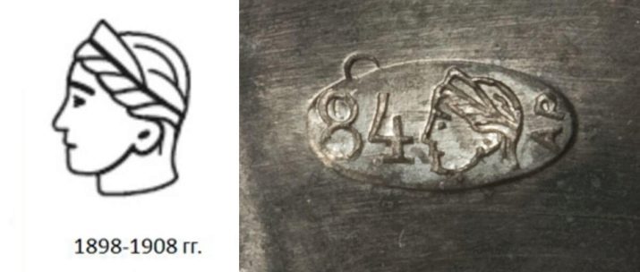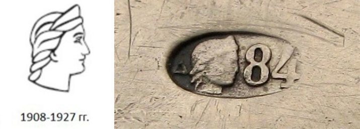 - Von 1908 bis 1927 begann in Russland Schmuck mit zu brandmarken Eindruck eines Mädchens in einem Kokoshnik, aber in einem Profil auf der rechten Seite. Das Schild wurde von einem griechischen Brief begleitet. Es wurde je nach Stadt geändert.