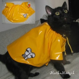 Περπατώντας με το ζώο στο δρόμο σε συννεφιασμένο καιρό, θα πρέπει να αποθέσετε ένα μικρό κάλυμμα βροχής για το κατοικίδιο ζώο σας. Παρόμοια μοντέλα, κατά κανόνα, έχουν κουκούλα και στερεώνονται κάτω από το λαιμό και την κοιλιά μιας γάτας. Τα αδιάβροχα είναι ραμμένα από ειδικά υδρόφιλα υφάσματα, όπως νάιλον ή χλωριούχο βινύλιο. Η πολυαμιδική ίνα με κορεσμένα χρώματα στις ιδιότητες και τα χαρακτηριστικά της δεν είναι σε καμία περίπτωση κατώτερη από μια διαφανή μεμβράνη. Αν ξαφνικά ξεκινήσει μια βροχή, το ζώο σε ένα τέτοιο μανδύα θα βρέξει μόνο τα πόδια του.