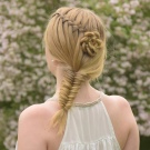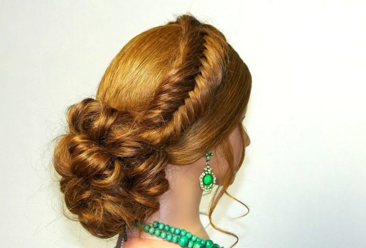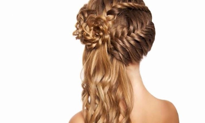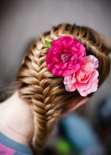 Εκπληκτικά hairstyles αποκτούνται αν χρησιμοποιείτε διάφορες πλεξίδες, οι οποίες στη συνέχεια χρησιμοποιούνται με διαφορετικούς τρόπους. Για παράδειγμα, μπορείτε να διαιρέσετε το κεφάλι διαγώνια σε τρία μέρη. Το πρώτο πράγμα που καταλαμβάνει την περιοχή γύρω από το μέτωπο είναι πλεγμένο σε ένα ψάρι, το δεύτερο και το τρίτο μόνο μισό, αφήνοντας τα μαλλιά χαλαρά, αλλά ασφαλίζοντας το με ελαστικό και στρίβοντας το στα άκρα. Από ένα τελείως υφαντό κορδόνι, σχηματίζεται ένα λουλούδι στο πλάι, το οποίο κλείνει τις λαστιχένιες ταινίες.