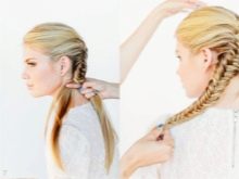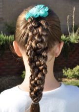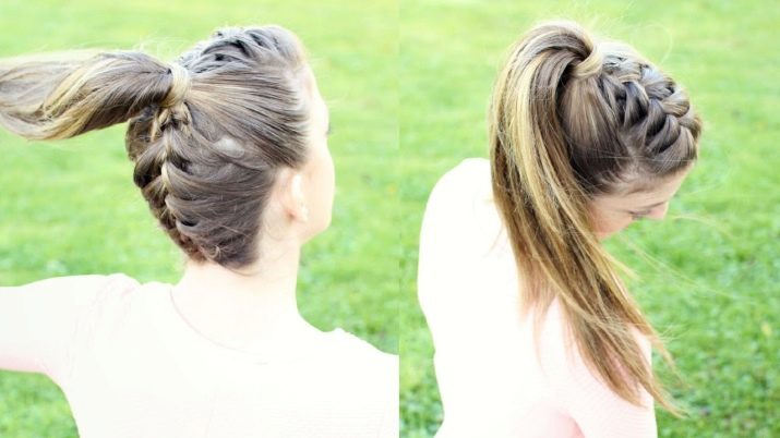 - Τα μαλλιά είναι καλά χτενισμένα και συλλέγονται σε μια υψηλή αλογοουρά. Η προκύπτουσα δέσμη διαιρείται σε δύο μισά, από την ύλη δημιουργείται ύφανση σύμφωνα με το κλασσικό μοτίβο. Τα άκρα συνδέονται με μια ελαστική ταινία.
