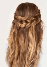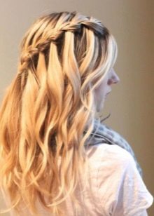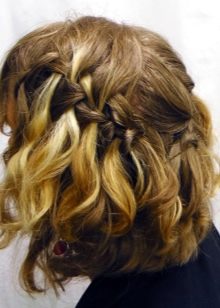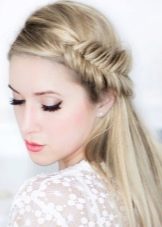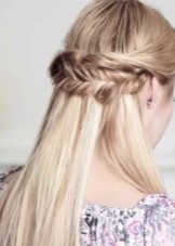 Αυτό το hairstyle για μεσαίου μήκους μαλλιά κάνει την εικόνα πιο θηλυκή και αρμονική. Η διαδικασία δημιουργίας αυτού του στυλ είναι ως εξής. Στη δεξιά πλευρά κοντά στην κροταφική περιοχή, θα πρέπει να ξεκινήσουν υφασμάτινα πλεξούδες από τρία σκέλη, ενώ πλέξιμο, προσθέτοντας νέα μαλλιά.