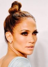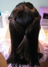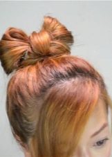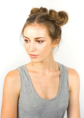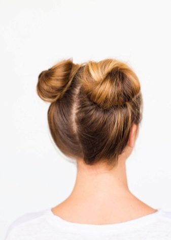 - Μια άλλη ενδιαφέρουσα επιλογή για στυλ με ένα σωρό μπορεί να εκδοθεί εάν χτενίζετε τα μπούκλες, τα χωρίζετε σε πανομοιότυπα μέρη και τα συναρμολογείτε σε δύο υψηλές ουρές. Τα άκρα είναι τυλιγμένα γύρω από τη βάση, καλυμμένα με φουρκέτες ή με σπείρωμα πάνω από διαφανείς ταινίες από καουτσούκ σιλικόνης. Αυτή είναι η καλύτερη επιλογή στυλ για νεαρά κορίτσια.