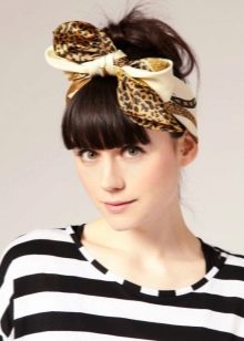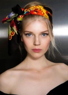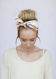 Ευκολότερος τρόπος - αυτό είναι να διαλύσει τα μαλλιά και χτενίστε καλά, τότε δέστε ένα διακοσμητικό κόμπο σε ένα φουλάρι και το βάζετε στο μέτωπο έτσι ώστε ο κόμπος που γίνεται είναι λίγο στο πλάι. Βάζω το άκρο του κασκόλ από κάτω και κρύβω τα άκρα πίσω από τη βάση του υλικού.