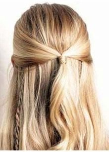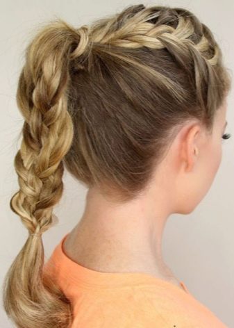 - Ένα όμορφο απαλό χτένισμα που φαίνεται ιδιαίτερα εντυπωσιακό το καλοκαίρι. Για να το συλλέξετε, πρέπει να διαιρέσετε τις μπούκλες σε δύο μισά κατά μήκος της γραμμής διαχωρισμού και στις δύο πλευρές να πλέξετε μάλλον σφιχτά κορδόνια που θα ξεκινούν από την περιοχή των ναών και στη συνέχεια θα συγκλίνουν στο πίσω μέρος του κεφαλιού, όπου θα πρέπει να στερεώνονται μεταξύ τους. Μετά από αυτό, ένα σκέλος διαχωρίζεται προσεκτικά από την ουρά, υφαίνει ένα πλέγμα από αυτό και σταθερό, στερεώνοντας το άκρο στο πίσω μέρος της γόμας.