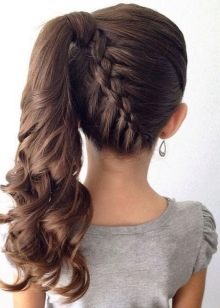 - Η ακόλουθη τεχνική είναι κατάλληλη για τους ιδιοκτήτες ευθεία λεία μπούκλες. Εδώ, τα μαλλιά χωρίζονται σε δύο μέρη από πάνω και από κάτω, τότε η κορυφή συνδέεται με διαφανές ελαστικό σιλικόνης στην ινιακή περιοχή από οποιαδήποτε άκρη.Από την κάτω πλευρά, πλέκεται υφασμένα, το πάχος του οποίου εξαρτάται αποκλειστικά από τις προτιμήσεις του κοριτσιού. Εν κατακλείδι, είναι απαραίτητο να στερεώσετε την πλεξούδα και την ουρά με μια ελαστική ταινία.