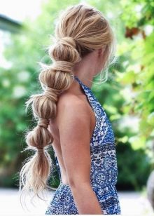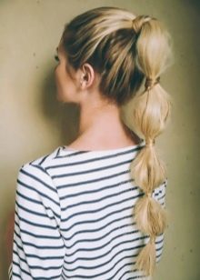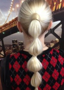 - Η επόμενη επιλογή είναι ένας πολύ καλός τρόπος να μεταμορφώσετε την πιο κοινή ουρά σε ένα κομψό χτένισμα σε μερικά λεπτά. Για να γίνει αυτό, ολόκληρα τα μαλλιά είναι στερεωμένα στο πίσω μέρος της κεφαλής, τότε ένα λεπτό σκέλος διαχωρίζεται και τυλίγεται γύρω από το ελαστικό έτσι ώστε να είναι καλά κλεισμένο. Μετά από αυτό, το δεύτερο κόμμι είναι προσκολλημένο λίγο χαμηλότερα - 8-10 cm από το πρώτο και πάλι τυλιγμένο με ένα λεπτό σκέλος. Ο αριθμός των τμημάτων εξαρτάται άμεσα από το μήκος των μαλλιών, είναι σκόπιμο να σφίξετε τα άκρα λίγο, έτσι ώστε το στυλ να φαίνεται το πιο θεαματικό και φυσικό.