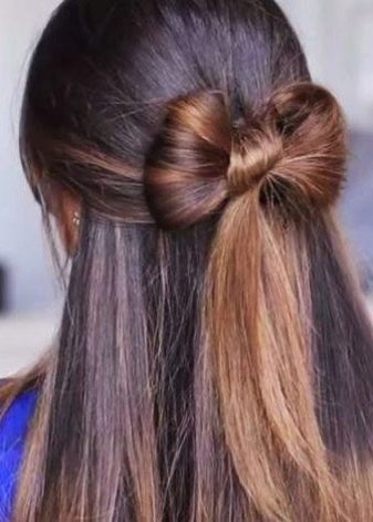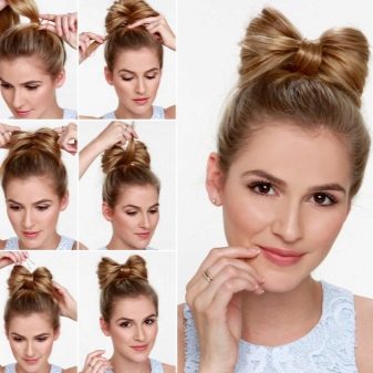 Για μια έξοδο διακοπών, μπορείτε πάντα να κάνετε ένα τόξο από τα μαλλιά, είναι ιδιαίτερα καλό σε επιμήκεις μπούκλες. Για να δημιουργήσετε ένα τέτοιο στυλ, πρέπει να χτενίζετε τα μαλλιά, να σχηματίζετε μια ουρά στο πίσω μέρος του κεφαλιού και να το στερεώνετε με μια ελαστική ταινία.