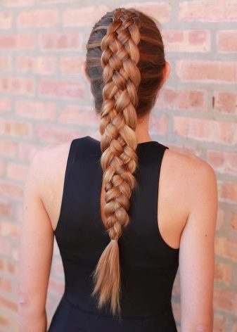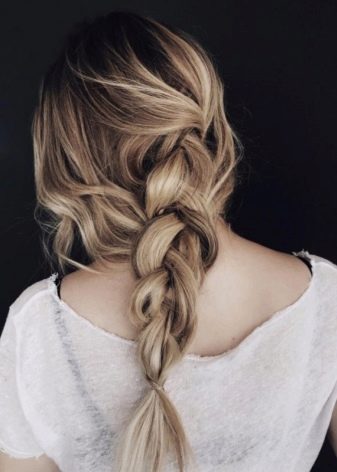 Για να δημιουργήσετε μια απαλή γυναικεία εικόνα, είναι απαραίτητο να χωρίσετε τα μαλλιά σε τρία πανομοιότυπα μέρη και να πλέξετε το πιο συνηθισμένο χοντρόκοκκο, στη συνέχεια να το στερεώσετε με μια μικρή λαστιχένια ταινία. Το άκρο της ύφανσης κάμπτεται ομοιόμορφα κάτω από τη βάση και χαλαρώνει λίγο, δίνοντας στυλ ένα κομψό βλέμμα - αυτό θα εισαγάγει μια ορισμένη pikancy στην εικόνα.