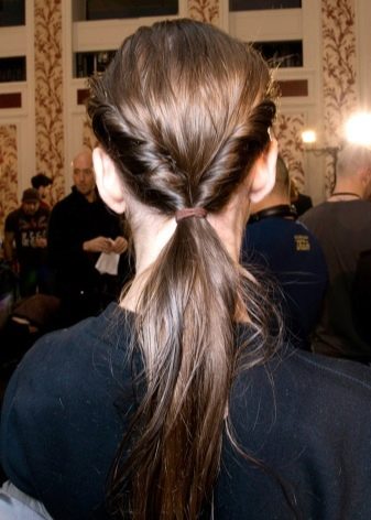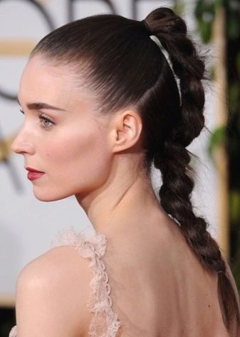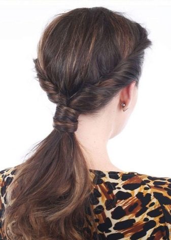 - Ένα παράδειγμα μιας πιο εκλεπτυσμένης και ευγενής ουράς. Για να το δημιουργήσετε, χρειάζεστε μους ή κερί. Κατ 'αρχάς, θα πρέπει να σχηματίσετε ένα ζυγό κομμάτι στο κέντρο ή την πλευρά, και στη συνέχεια να μαζέψετε ολόκληρη τη σφουγγαρίστρα από τη μια πλευρά. Μετά από αυτό, ο αφρός εφαρμόζεται στους κλώνους, έπειτα ένας κόμπος συνδέεται δύο φορές και στερεώνεται με αόρατα δεξιά κάτω από το σημείο της ύφανσης - και η τοποθέτηση είναι έτοιμη.