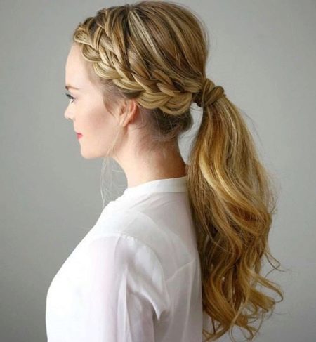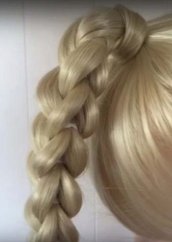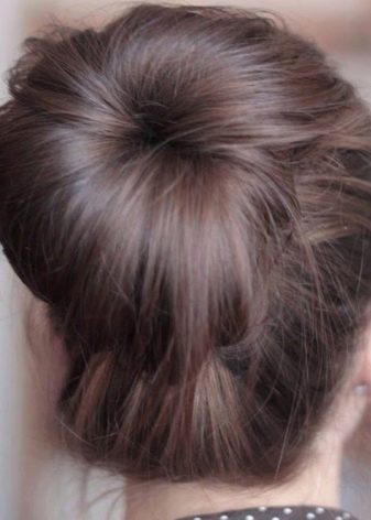 - Από τη μία πλευρά του χωρίσματος, πρέπει να πάρετε μια λεπτή κλειδαριά και να πλέκω. Ένας μικρός σωρός γίνεται στην κορυφή της χτένας και συλλέγεται μια υψηλή ουρά έτσι ώστε να δημιουργείται στην κορυφή ένας όγκος και το απαραίτητο μεγαλείο. Τα μαλλιά είναι στερεωμένα σε σφιχτό πλεξούδα και τυλιγμένα γύρω από τη βάση, καλύπτοντας το ελαστικό.