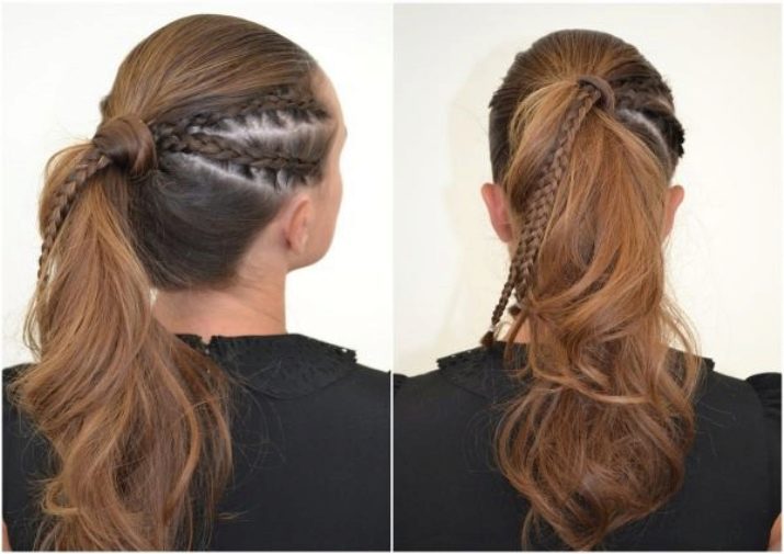 Για παράδειγμα εξετάστε την επιλογή με την ύφανση. Για να φτιάξετε ένα κομψό στυλ, πρέπει να πάρετε δύο σκέλη στη δεξιά πλευρά και να πλέξετε την πλεξούδα. Στη συνέχεια, επαναλάβετε τα ίδια βήματα στην αριστερή πλευρά, διασχίστε και τα δύο υφάσματα και στερεώστε με μια ελαστική ταινία. Στη συνέχεια, πρέπει να επιλέξετε δύο ακόμη σκέλη ακριβώς κάτω από τα πρώτα, πλέξιμο ξανά τις πλεξίδες και ασφαλίστε με μια ελαστική ταινία.Όταν και τα δύο υφάσματα είναι έτοιμα, απλά πρέπει να παραλείψετε την κορυφή μέσω του κάτω μέρους και να χαλαρώσετε ελαφρώς τις πλεξίδες για να δώσετε στο κομμωτήριο μια ελαφρώς ελαστική και πιο ογκώδη εμφάνιση.