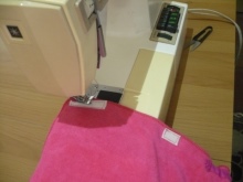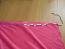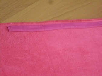 In order to sew on an elastic, you will need a piece of cotton fabric along the length of the elastic and slightly wider. It is sewn to the towel along the upper edge, then an elastic band is threaded into the resulting drawstring and fixed at the edges of the segment. After the Velcro is sewn, the pareo is ready.