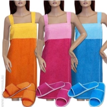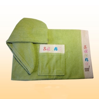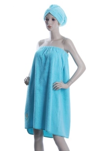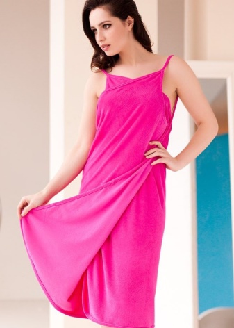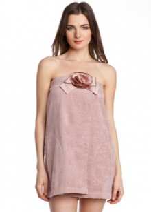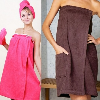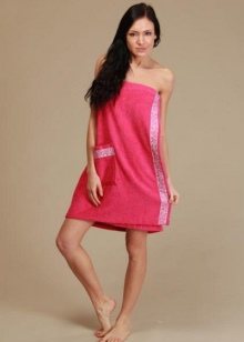 Bathhouse dresses made of terry can be decorated with embroidery and are most often made plain, some styles are sewn with pockets. There are models with lace and bows or with ruffles at the top. A part of bath towel dresses is sold complete with a turban, mitten or bath slippers. The choice of colors is very wide: pink, blue, red, green, yellow, olive and others, you can always choose to your liking.