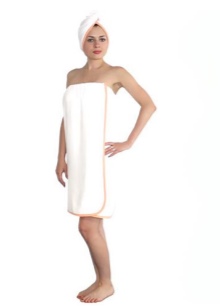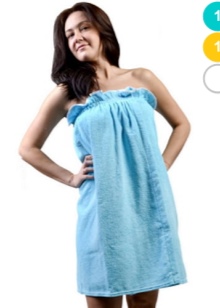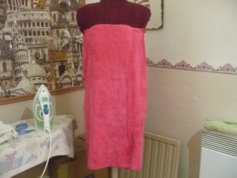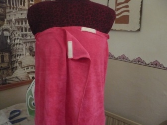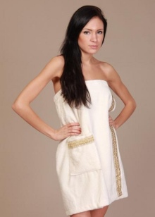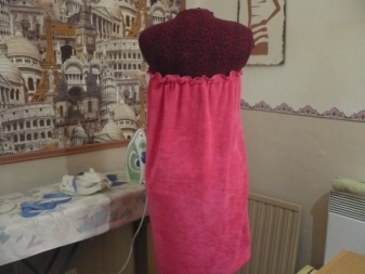 Some craftswomen make such bath dresses from ordinary towels. Velcro fasteners are attached at the ends of the towel, taking into account the expected depth of the odor, and the middle of the panel is added with an elastic band, which is sewn from the inside somewhere about a centimeter from the edge. The width of the gum can be different, choose it taking into account the weight of the towel, the length is determined after fitting. During the fitting, the elastic should be slightly tightened.