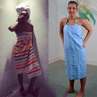 Bath pareo, unlike a towel, is made with an elastic band that provides a snug fit to the body. And the presence of Velcro fastener gives confidence that the pair is securely fastened and will not fall as a result of awkward movement.