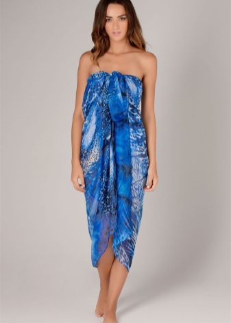 Some of the styles look like a traditional pareo, whose homeland is the island of Tahiti. Other models look like dresses on the figure, since they are made with straps at the ends of the panel, the strap on the right side is thrown on the left shoulder and vice versa. In this case, the back remains almost open, and the bath dress becomes very similar to an elegant evening outfit.