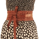 - One of the most common are leather belts. They look very expensive and beautiful. Such details can be worn not only over dresses, blouses and blouses, but also sheepskin coats, fur coats or coats. A leather strip can be not only smooth, but also perforated with patterned edges.