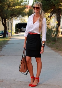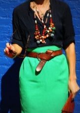 Skirts look very nice with belts, but are combined with them on the same principle as trousers - that is, it makes no sense to wear a decorative belt if an elongated blouse, top or T-shirt falls over it. Decorative items are used only to create a spectacular accent in the femoral area or at the waist.
