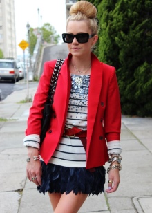 The look consisting of a striped skirt of a non-standard cut, a turtleneck and an elongated jacket with a rounded neckline looks very sophisticated. This combination is complemented by a wide leather belt worn over the jacket, a small handbag and red shoes with a trapezoid heel.