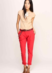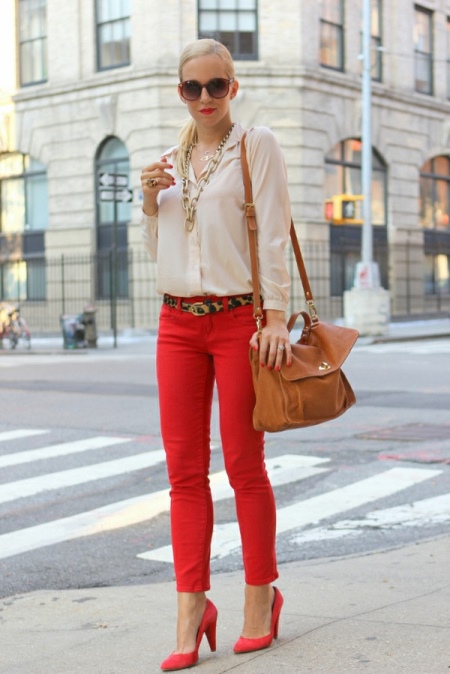 A bold urban bow, consisting of red trousers and a graceful ivory blouse, is very successfully complemented by a leopard-colored belt. And the unusual details, in the form of a brown bag, a large golden chain and suede red shoes, are what you need to complete this outfit.