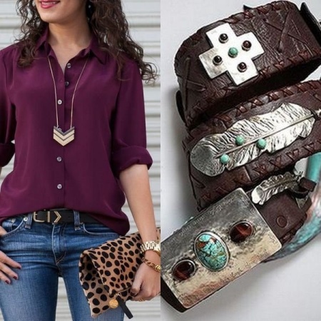 The second place is occupied by products with unusual buckles, which are usually combined with trousers and jeans. Buckles with natural minerals, with a decorative element in the form of a feather or a cross, carving, embossing and perforation, will be an ideal option for everyday dress.