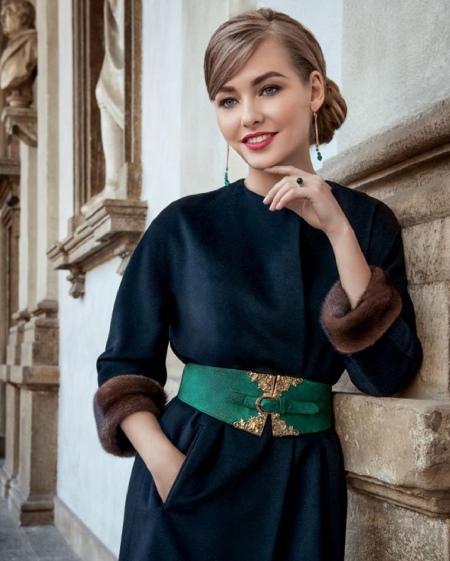 A beautiful belt can be used as an accessory for outerwear. For example, in this image, a cashmere coat of a deep blue hue, with shortened sleeves, looks great with a wide suede belt decorated with gilded details.