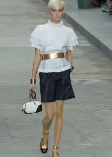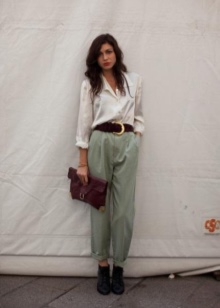 - Ensembles in which there is a female strap and trousers look beautiful. Such kits are able to attract attention to one or another female form. For example, accessories with a low rise will emphasize the beautiful hips of its owner, and a high rise will emphasize a voluminous chest.