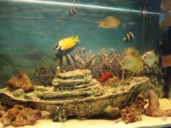 The decor of a mini-pond is often wrecks, covered with moss and algae, in the gaps of the windows of which chests of gold are visible. These are mermaids-sirens, which dragged more than one man into the whirlpool, these are underwater rocks and huge artificial crabs of bright colors.Original aquariums for those who invest in a design concept a certain artistic idea. Someone contains an herbalist aquarium exclusively, in which there are no living inhabitants, but impressive large black fish (artificial) swim or somewhere, at the very bottom, there is a persistent tin soldier.