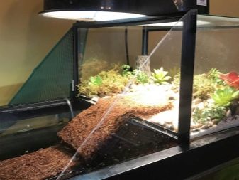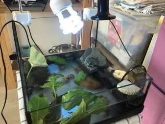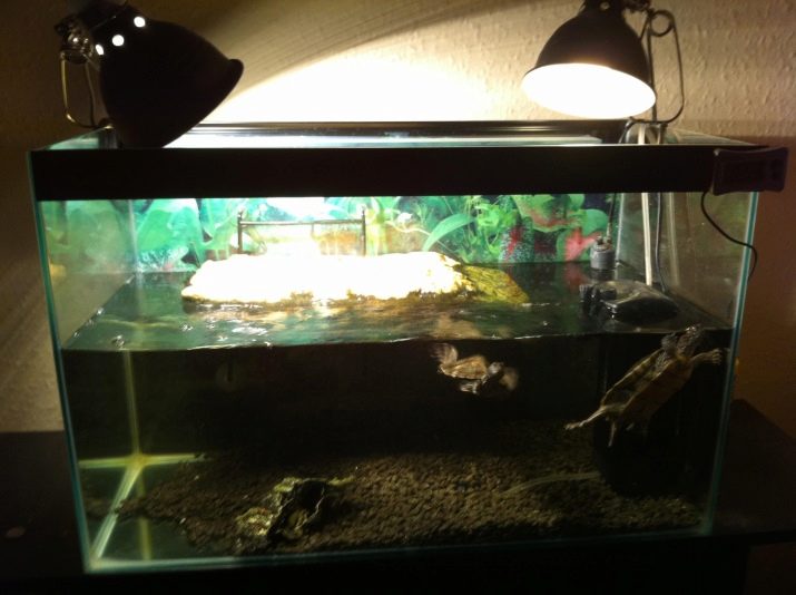 Reptiles are animals in which the regulation of body temperature is carried out thanks to external sources. In conditions of natural habitat, turtles, as necessary, are either in the sun or in the shade. Therefore, the aquarium also needs to provide for the presence of both an illuminated warm area and a cooler shadow zone. To achieve this, a heating lamp is installed in the corner of the aquarium.