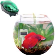 Also for small ponds there are mounted filters. This filter is perfect for round aquariums with a volume of 5 to 10 liters. Filters come in two types: with internal and external mounting. The internal device is completely immersed in the reservoir, and the external is attached to the outer edges of the tank. For round aquariums, an external mount is preferred. Some models of mounted filters equipped with LED backlight.