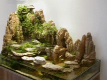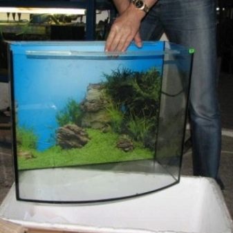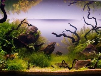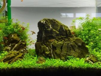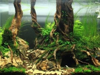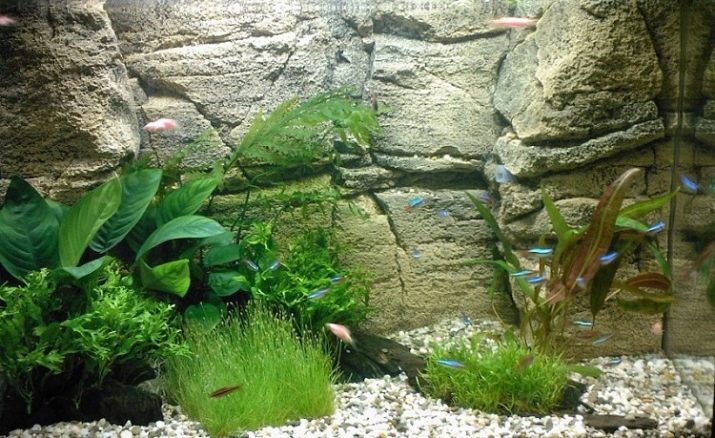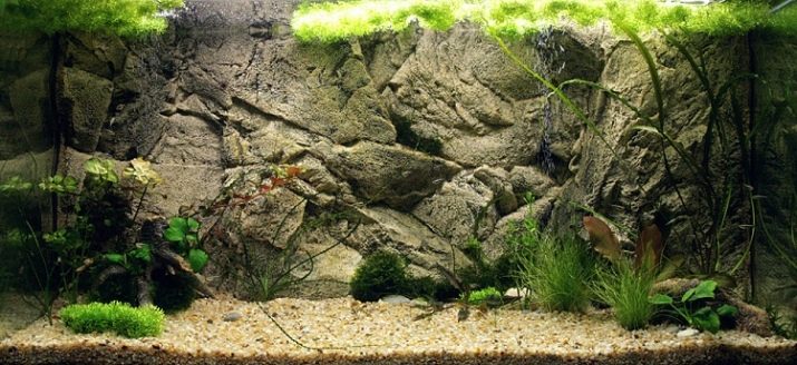 An unusual solution will be to design the back wall of the aquarium with a living background, for which they use moss. In this case, it is necessary to use a metal or plastic mesh twice the size of the decorated wall. The fixators of this background will be suction cups and colorless fishing line. Setting such a background is not difficult: half of the grid is evenly covered with a layer of moss, after which it is covered with the second half of the grid.