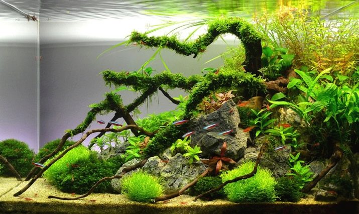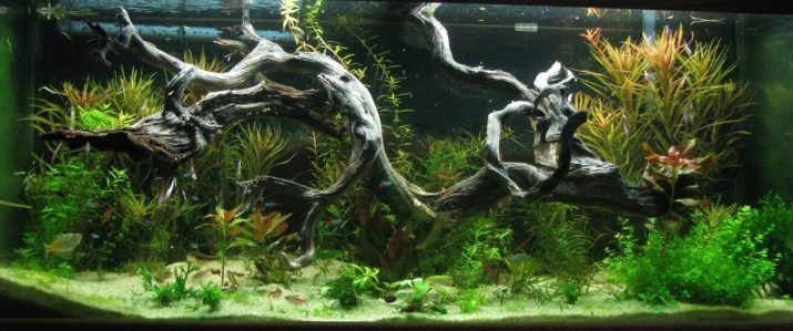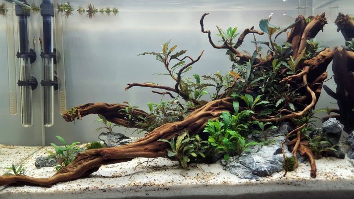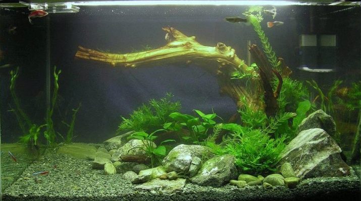 The design of the aquarium with snags can be complemented by beautiful stones and, of course, algae.