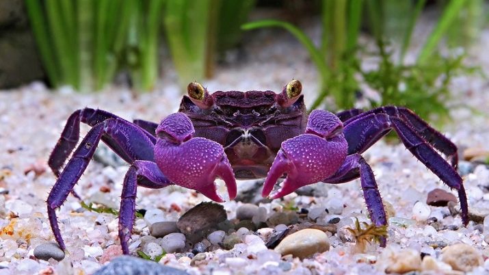 One of the most exotic crabs: his body is painted in a very expressive purple color. Arthropod eyes are also expressive: bright orange. It is small in size, up to 3 cm. Therefore, an aquarium or aquaterrarium of 30–40 l is sufficient for such a representative of crustaceans. At home, he eats small insects or special food for crabs.