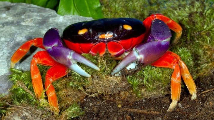 Will argue in popularity with the Dutch rainbow crab. It is often called differently: indigo, terrestrial, tricolor, patriot. In nature, rainbow crab is found on the Pacific shores. This species is distinguished by a special, very bright color. The shell can be purple or bright blue, the limbs are dark orange, the lower part is light beige. Adult arthropod grows to 20 cm.