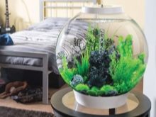 When choosing an aquarium sphere, first of all, it is necessary to take into account its harmony in the interior. Using a variety of colors, it can be placed in a room made in almost any style. Illumination, colored stones and artificial plants in the design of the aquarium will help bring it into line with the general plan. So, for historical and ethnic interiors, a spherical aquarium of large volumes, at least 20 liters, with natural soil from coarse sand and pebbles and real plants is more suitable