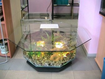 In order to calculate the volume of other forms of aquariums (triangular prism, octagon and others), you need to divide into simpler geometric shapes, make a calculation of each of them separately and then add the results. There is another method for calculating the internal volume. It is simple and accurate, but rather laborious. To do this, we need a container of a certain size (any jar is suitable). To determine the actual capacity of the tank, simply fill it with water from a measuring vessel. Multiplying the number of poured containers by its value, we obtain the volume of the tank.