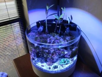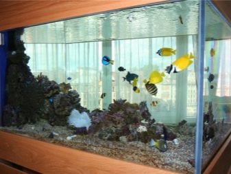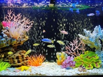 - Pseudo-sea. This type imitates the marine environment using corals, sandstones, limestone, a large number of stones similar to marine, and various fish, mainly from the cichlid family, which have a bright and colorful coloring. Living plants in such aquariums are most often not used.For lighting, you need to choose blue lamps that simulate the color of sea water.