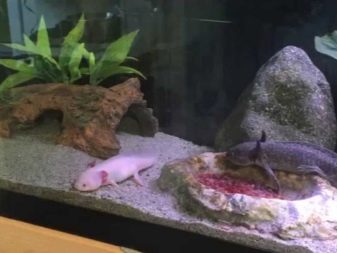 Any objects that are in the tank do not imply sharp angles - otherwise the salamander may cut itself, its body is very tender. Of the plants, sagittaria, naias, cladophore, ludwig are preferred.