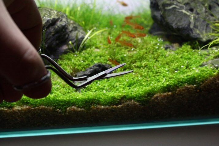 According to experienced aquarists, cutting a chemanthus cube with a size of 0.25 m2 can take about an hour. The formation of an aquarium lawn is necessary when, with a lack of light, the stems become very elongated. After removal of the tops, the stem of kallitrichoids is exposed, and small processes stick out in different directions.