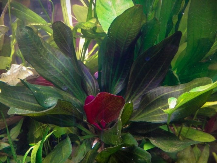 The plant of the aroid family looks like a miniature bush with a large rhizome. The height of the bush depends on the type and content and can vary from 5 to 100 cm. In a home aquarium, a plant can grow up to 26 cm in height.