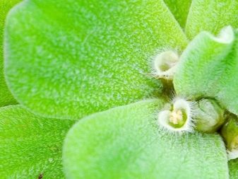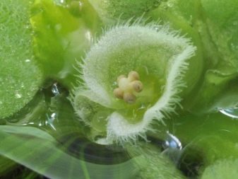 Elongated and slightly depressed veins are parallel to the length of the leaf. This gives the plates a corrugation effect, which additionally ensures the stability of the plant on the surface of the water. The surface of the leaves is covered with short gray hairs, preventing the plate from getting wet. The length of the cob is not more than a centimeter. It is shrouded in a leaf of light green color and is located on the top with several male flowers.