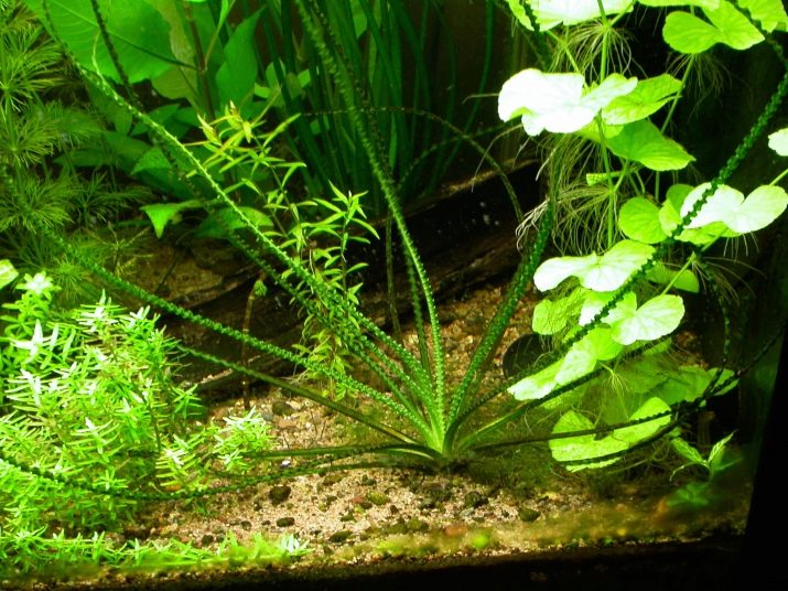 The most common inhabitants of aquariums include Wallisneria, Canadian Elodea, variegated hygrophil, yellow cryptocoryne, lemongrass, aponogeton.